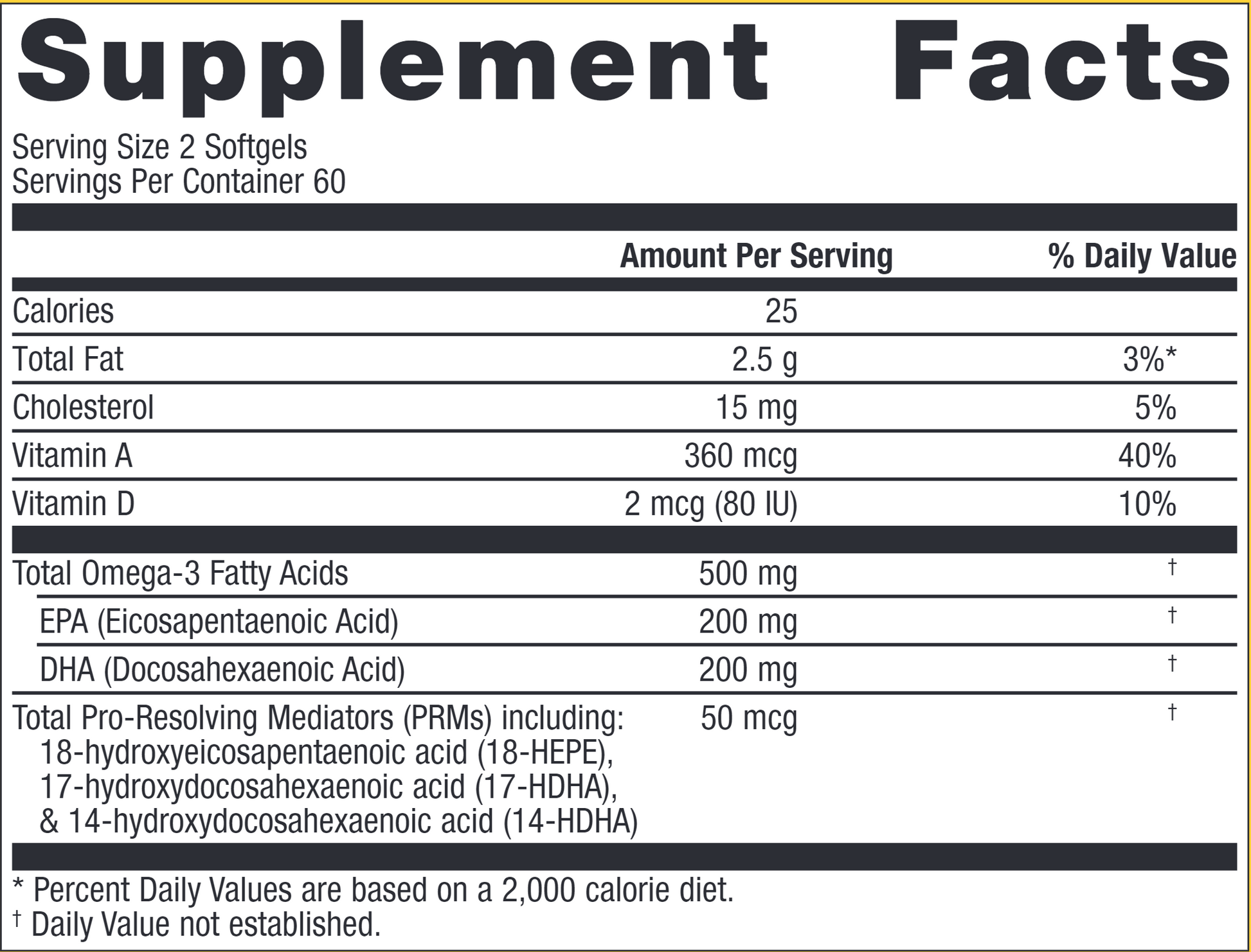 View compareOne Serving (2 Softgels) contains a naturally occurring spectrum of omega-3 fatty acids with bioactive pro-resolving mediators, as well as all-natural forms of vitamin A and vitamin D.