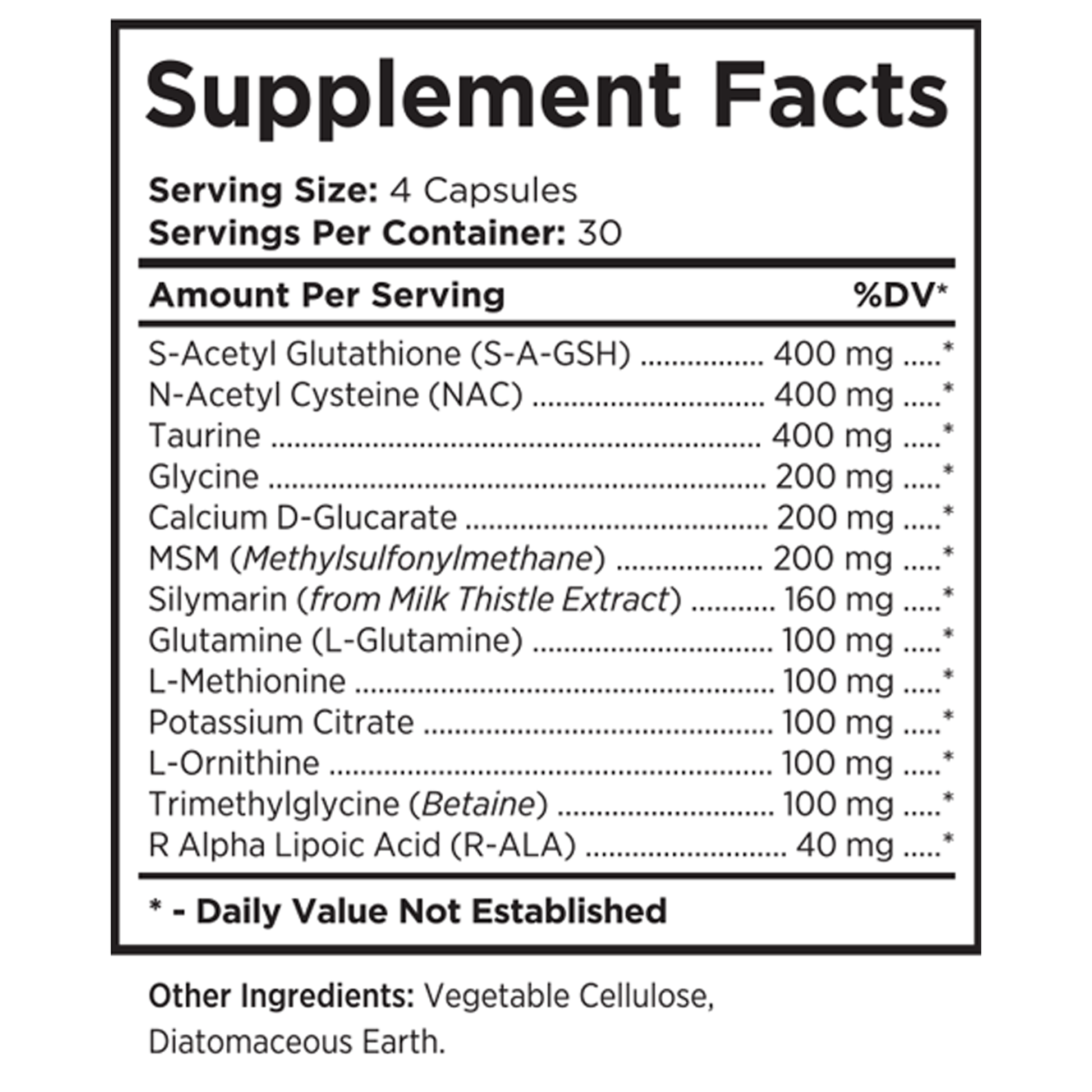 Comprehensive Detoxification Pathways: Beyond glutathione conjugation, this formula supports all six major detoxification pathways in the liver: acetylation, methylation, amino acid conjugation, sulfur conjugation, and glucuronidation, offering a holistic detox solution*