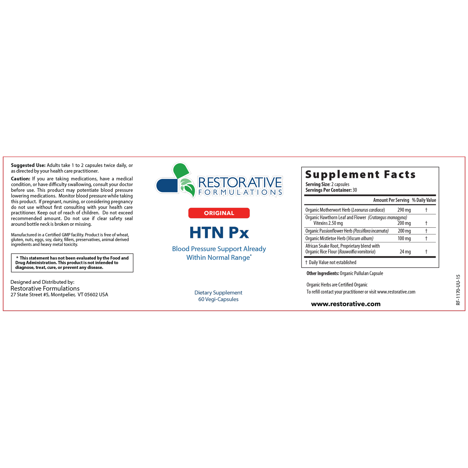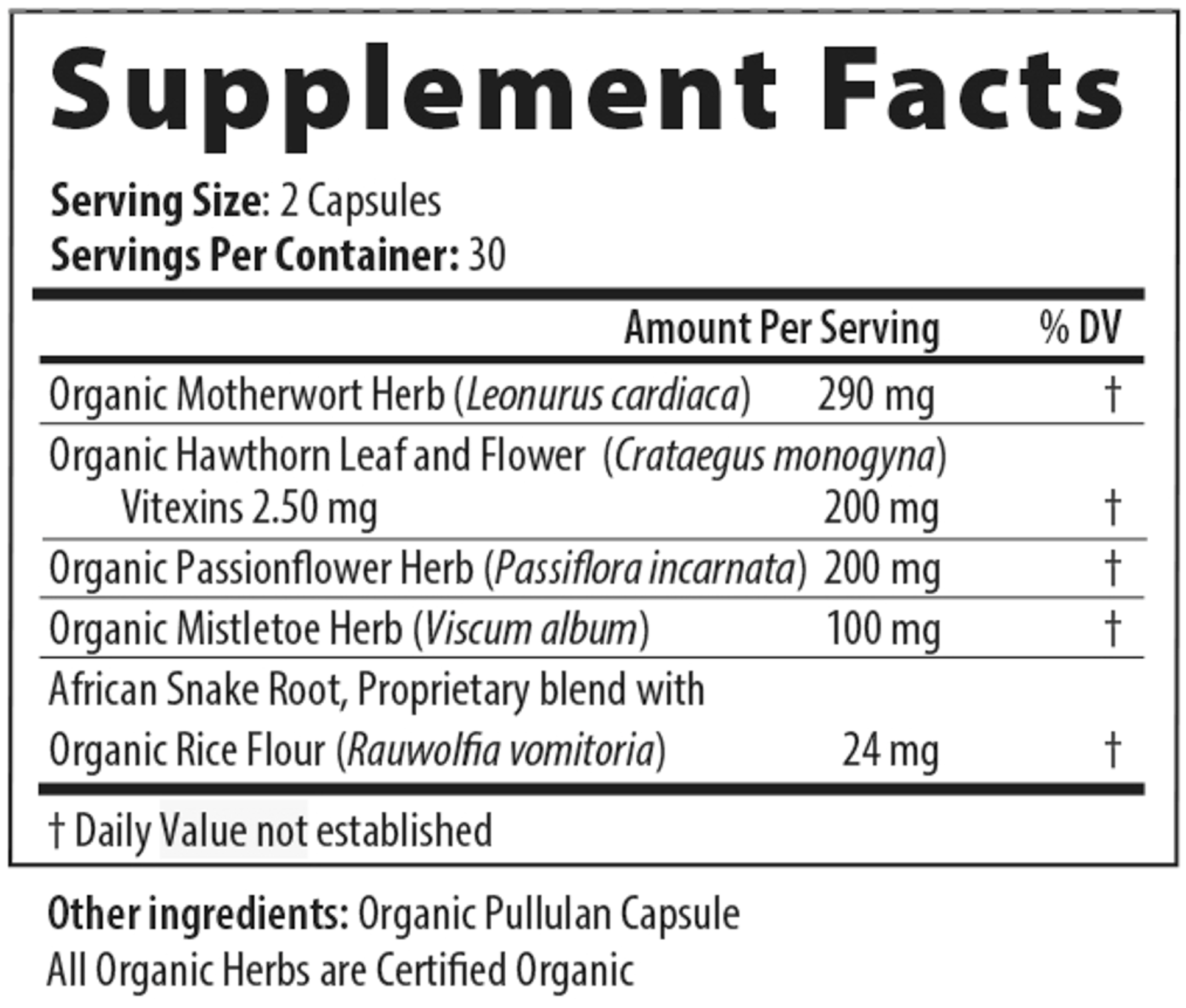 African Snake Root was also chosen for this formula due to general calming effects. The Mistletoe leaf is included to supply vasoactive amines for encouraging vascular tone. Likewise, Hawthorn berry was added to bolster support of the vascular system. This combination of herbs works via a number of distinct mechanisms that ultimately preserve healthy blood pressure.