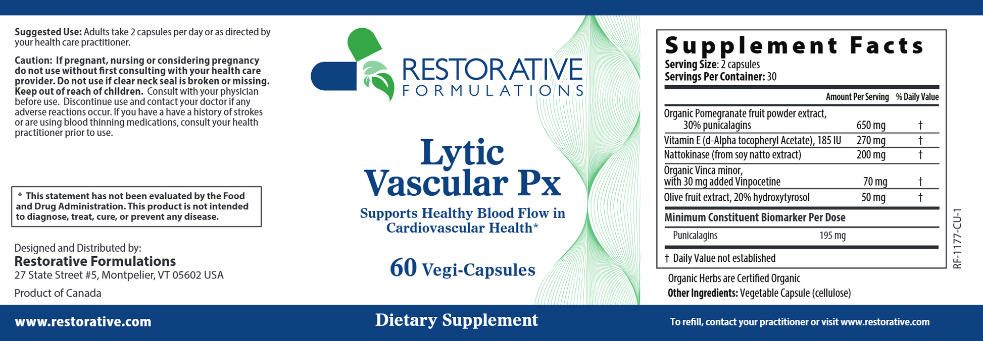 View compareLytic Vascular Px promotes cardiovascular health, inhibits oxidative stress, and supports a healthy inflammatory response. Lytic Vascular Px provides a blend of synergistic cardiovascular antioxidant cofactors supporting many pathways of cardiovascular health. Endothelial dysfunction is targeted by activating the endothelial nitric oxide synthase pathway, supporting free radial scavenger activity to guard against vascular processes and oxidative damage. Lytic Vascular Px was created using novel extraction methods to maximize the quality and bioavailability of the active plant compounds.