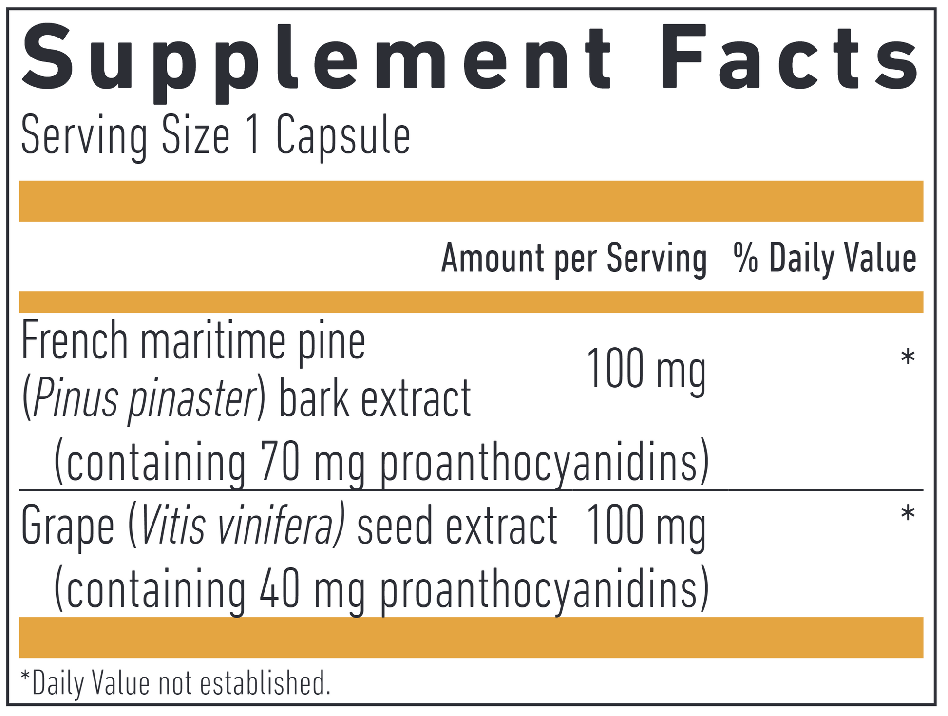 View comparePycnogenol Superior 100 GOLD is a purely plant-based product containing 100 mg patented pine bark extract (Pycnogenol®) and 100 mg grape seed extract. Pine bark extract supplies a high proportion of powerful antioxidants, procyanidins, bioflavonoids and organic acids.