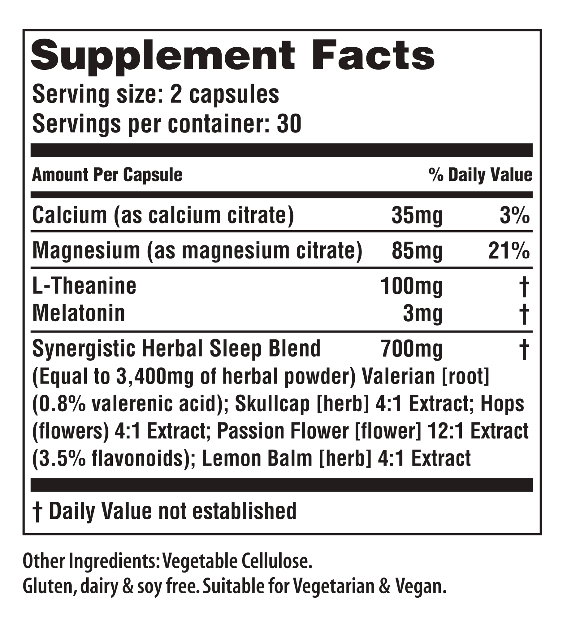 Theanine- An amino acid (from Green Tea but no caffeine) shown to help create relaxing Alpha brain waves so you can “turn off” and get ready to sleep.*