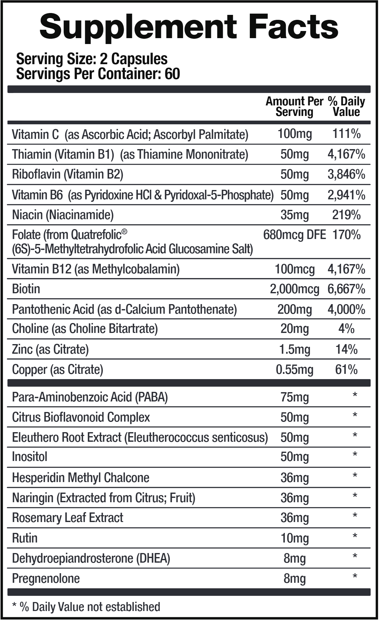 • Vitamin C/Bioflavonoid blend- HPA Axis supporting adaptogens - B vitamin core - DHEA and Pregnenolone*