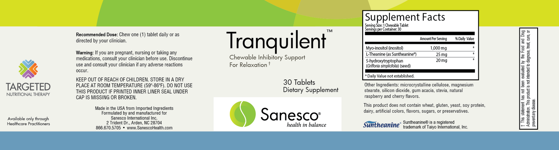 Tranquilent™ includes ingredients that support the action of inhibitory neurotransmitters.* 5-HTP supports serotonin synthesis.* Myo-inositol works to support serotonergic receptors.* Theanine, as Suntheanine®, supports both the release of GABA and its function.*