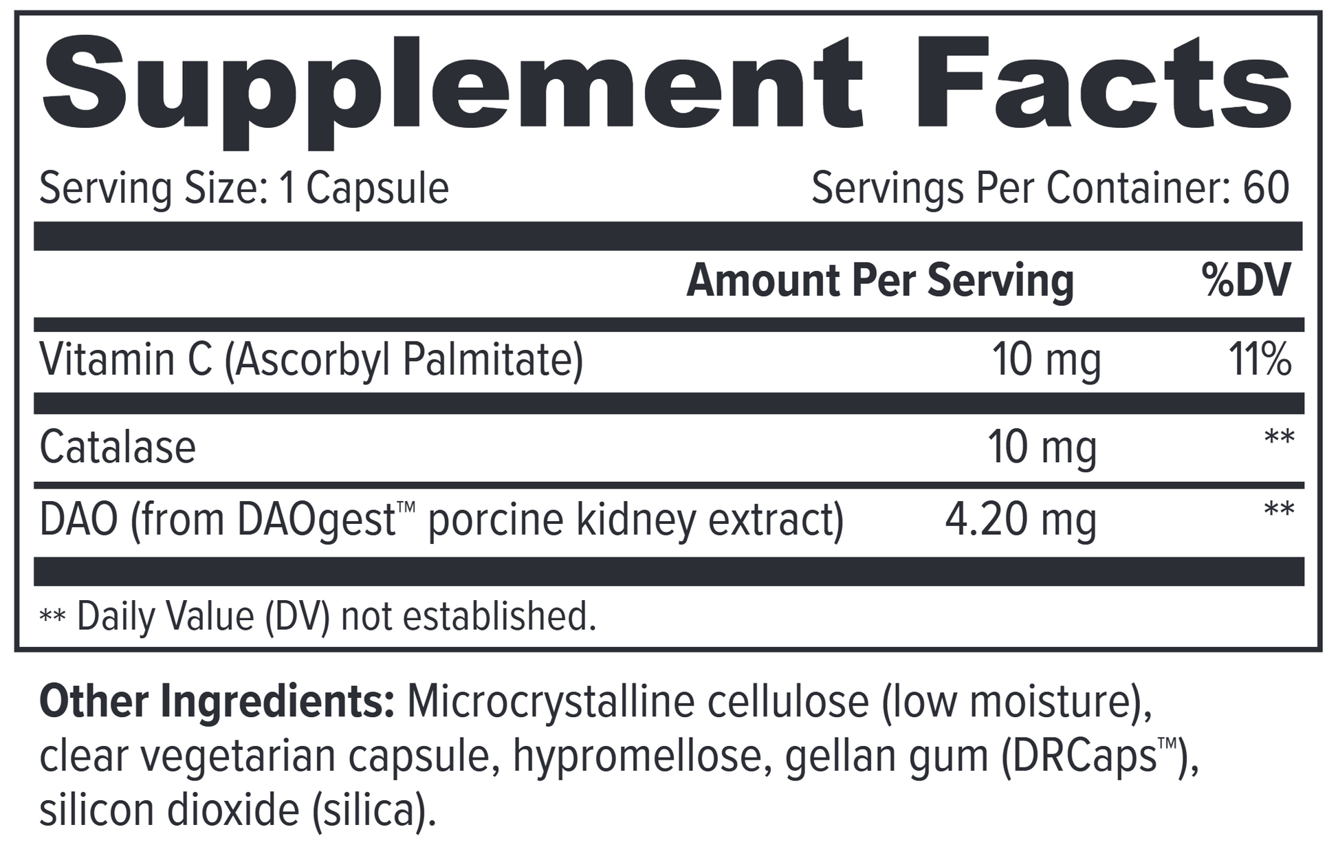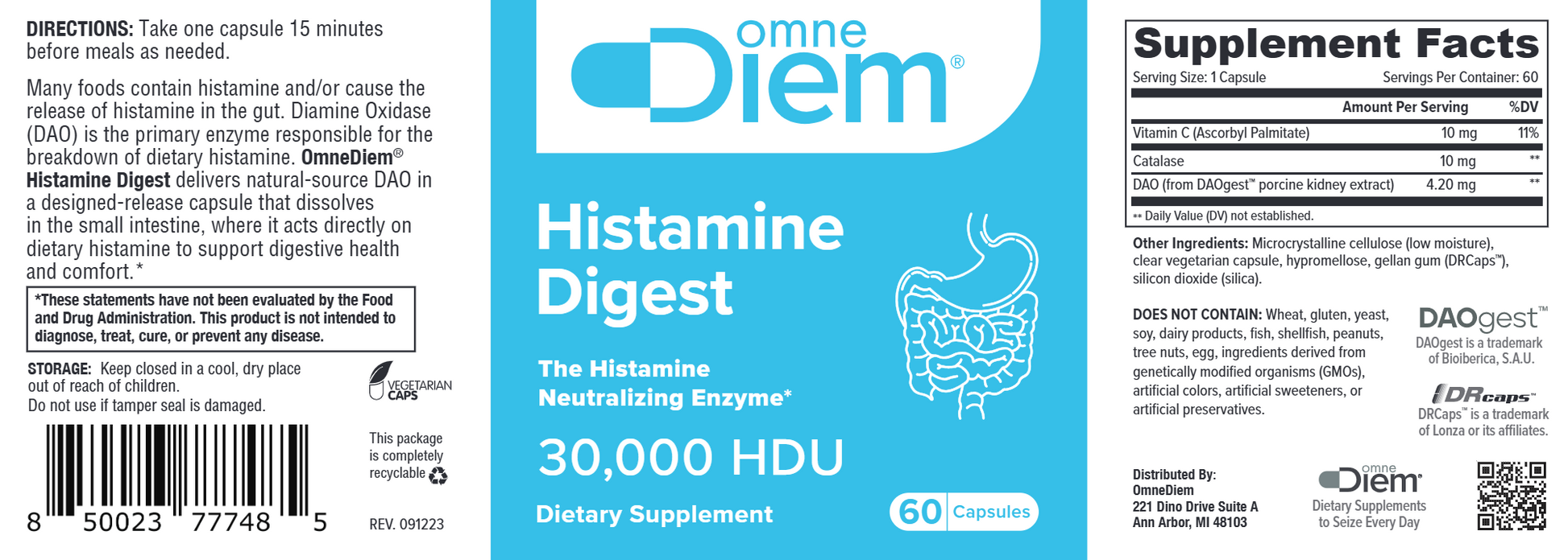 Many foods contain histamine and/or cause the release of histamine in the gut. Diamine Oxidase (DAO) is the primary enzyme responsible for the breakdown of dietary histamine. OmneDiem® Histamine Digest delivers natural-source DAO in a designed-release capsule that dissolves in the small intestine, where it acts directly on dietary histamine to support digestive health and comfort.*