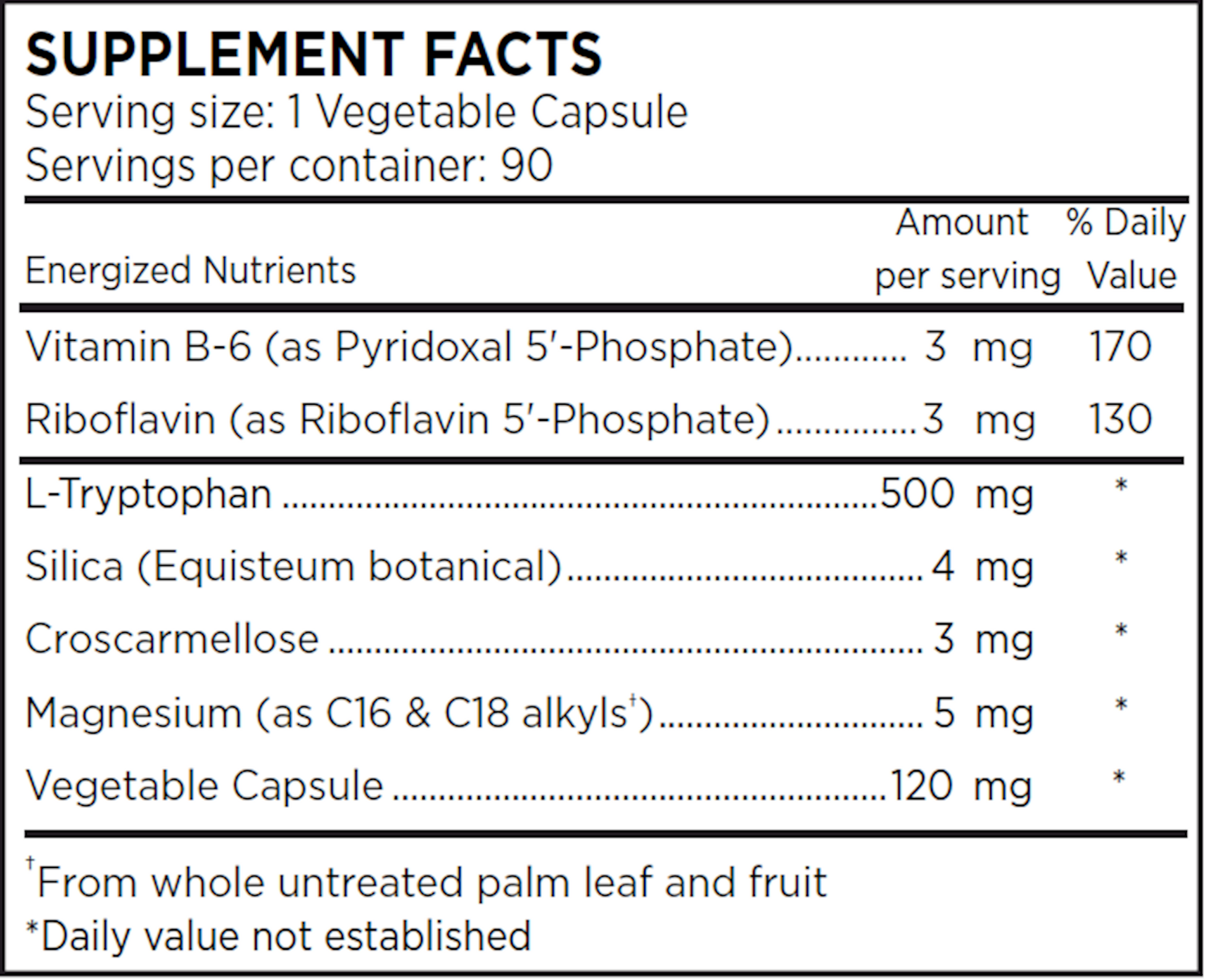 Fact: Pure L- tryptophan formulation with vitamins B2 and B6 for enhanced uptake and function.