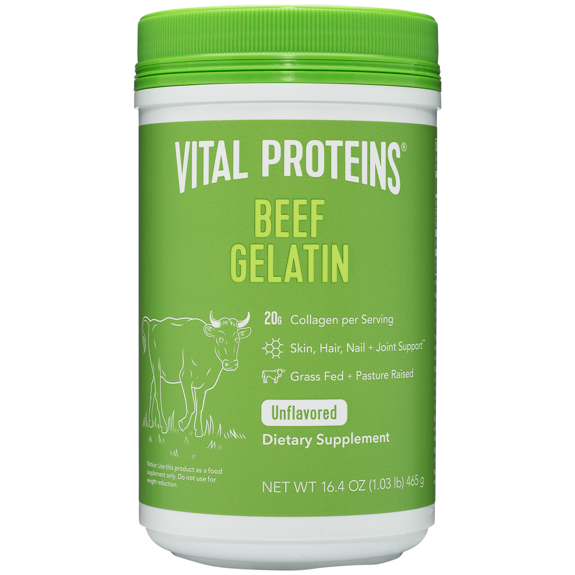 View compareSourced from the hides of grass-fed, pasture-raised bovine, Vital Proteins® Beef Gelatin is a premium powdered supplement that can help support hair, skin, nail, bone and joint health.** This unflavored powder is made without gluten, and contains no artificial flavors or fillers. Beef Gelatin easily and completely dissolves in hot liquids, like tea or broth, but solidifies once mixed into cold liquids, making it a great thickening agent in recipes, such as stews and custards. Because of its gelling, gelatin is commonly used in culinary applications, such as gummies, candies, sauce thickeners, etc.