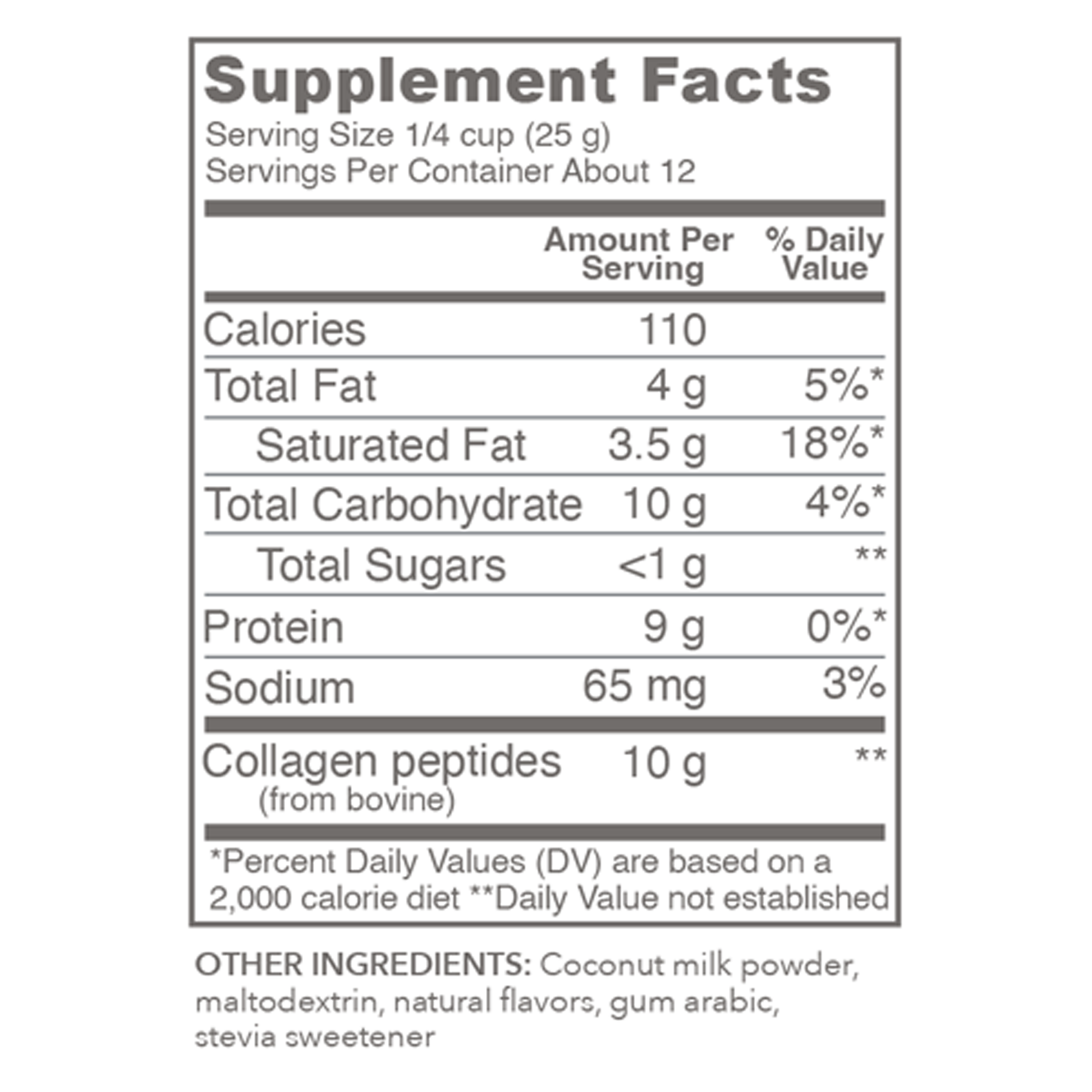 Organic Coconut Milk Powder: Our Vanilla Collagen Creamer™ supplement includes 9g of healthy fats from organic coconut milk powder. FYI: Coconut is an excellent source of Medium Chain Triglycerides (MCTs).