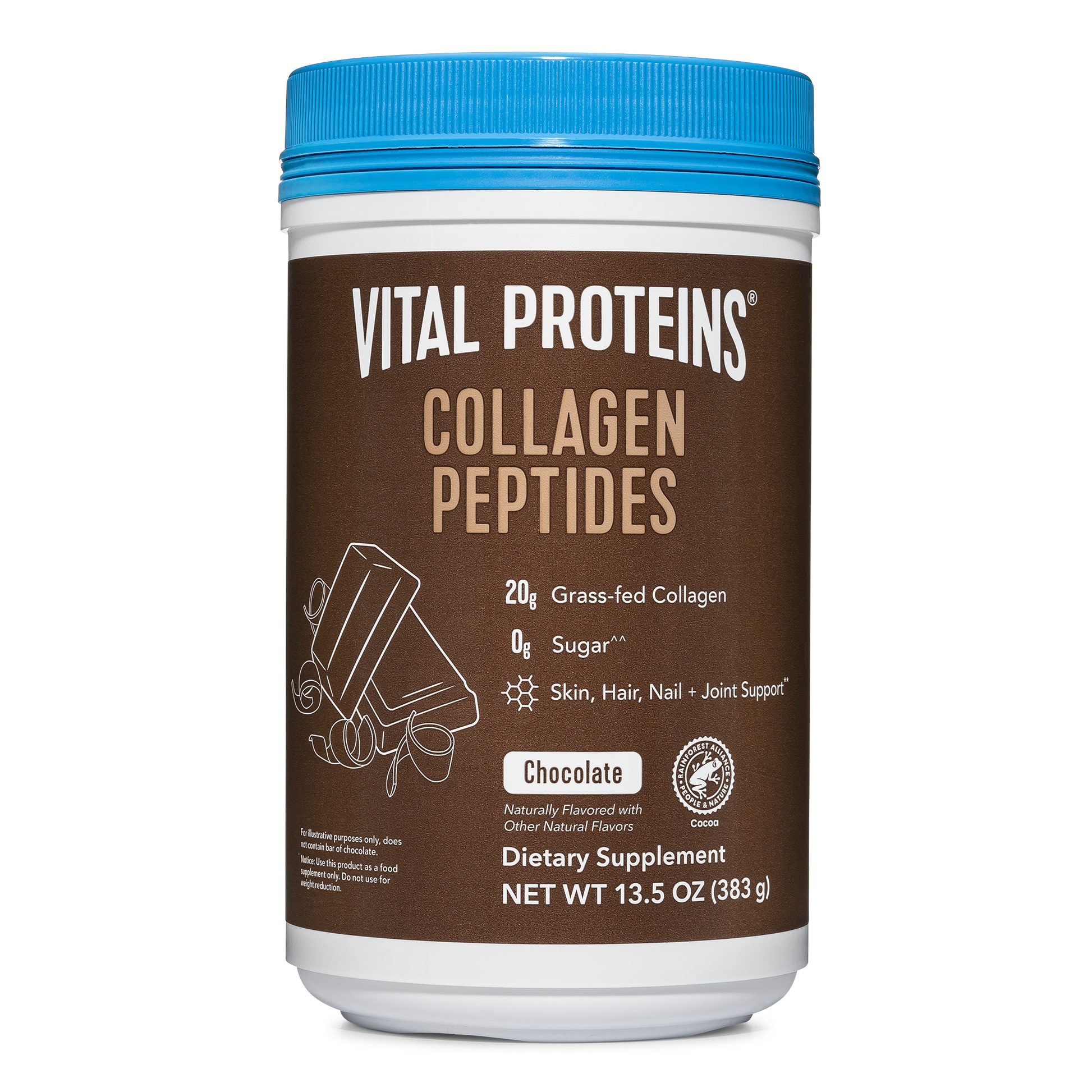 View compareVital Proteins Chocolate Collagen Peptides combine collagen for your wellness goals and chocolate for your tastebuds. Our collagen peptides are expertly sourced from a single ingredient of grass-fed, pasture-raised bovine hides, ensuring a high quality source of this nutrient that helps support healthy hair, skin, nails and joints.** Coupled with the addition of alkalized cocoa powder, and sweetened with stevia, you'll enjoy a decadent taste that still fits your wellness goals. Each serving of this powdered supplement will easily dissolves in any hot or cold beverage or your favorite recipe.