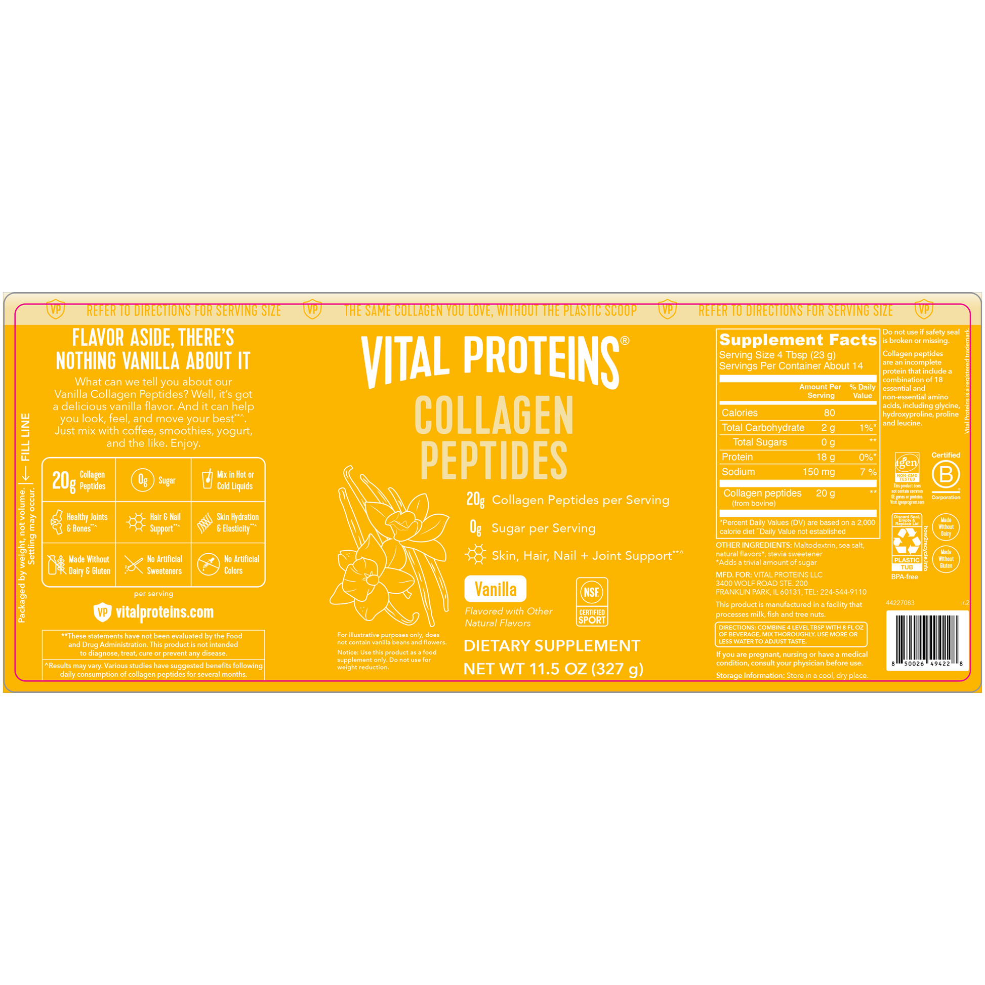 View compareVital Proteins Vanilla Collagen Peptides combine collagen for your wellness goals and classic tasting notes of vanilla for your tastebuds. Our collagen peptides are expertly sourced from a single ingredient of grass-fed, pasture-raised bovine hides, ensuring a high quality source of this nutrient that helps support healthy hair, skin, nails and joints.** Made with natural vanilla flavor and a touch of stevia, Vanilla Collagen Peptides contains 0g of sugar. Each serving of this powdered supplement will easily dissolve in any hot or cold beverage or your favorite recipe.