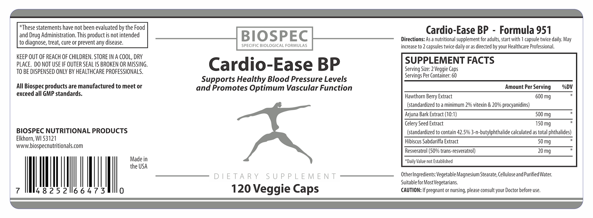 Посмотреть сравнитьCardio-Ease BP is a high potency combination of Celery Seed Extract, Hawthorne Extract and Arjuna Bark Extract plus Hibiscus Sabdariffa Extract and Resveratrol to support cardiovascular function and maintain normal blood pressure levels already within normal range.*