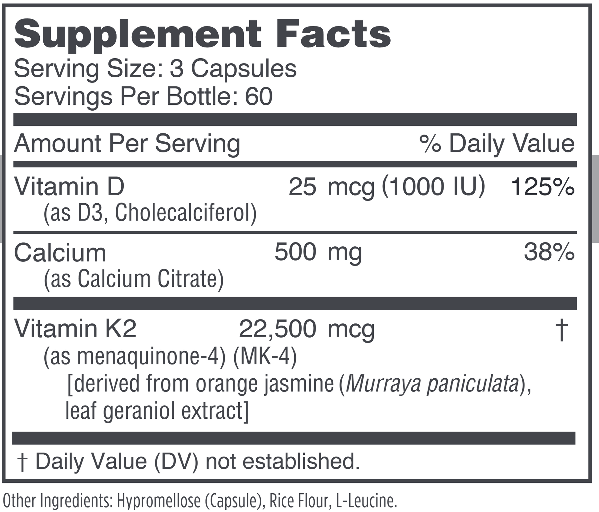 NBI has created three versions of its bone support products to meet people's unique nutritional needs. All three formulas provide 45 mg/day of MK4® and 50 mcg/day (2000 IU/day) of vitamin D3 to promote healthy bone density, support healthy bone marrow, and maintain strong bones.* The only difference between the formulas is the amount of calcium. Osteo-K® provides 1000 mg/day of calcium, Osteo-K Minis has 400 mg/day, and Osteo-MK4 has no calcium.