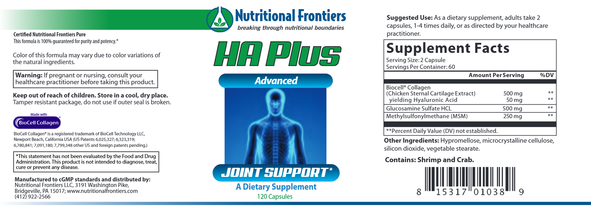 BioCell Type II Collagen Matrix consists of Collagen, Hyaluronic acid in a patented delivery system utilizing a low molecular weight H.A. (less than 30,000 daltons) for optimal utilization by the body and chondroitin sulfate. 60 mg of H.A. per serving.