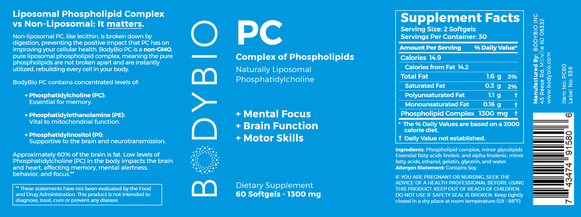 Why BodyBio PC? Non-liposomal PCs, such as lecithin, are broken down by digestion, preventing the positive impact PC has on improving your cellular health. BodyBio PC is a non-GMO, pure liposomal phospholipid complex, meaning the pure phospholipids are not broken apart and are instantly utilized, re-building every cell in your body.
