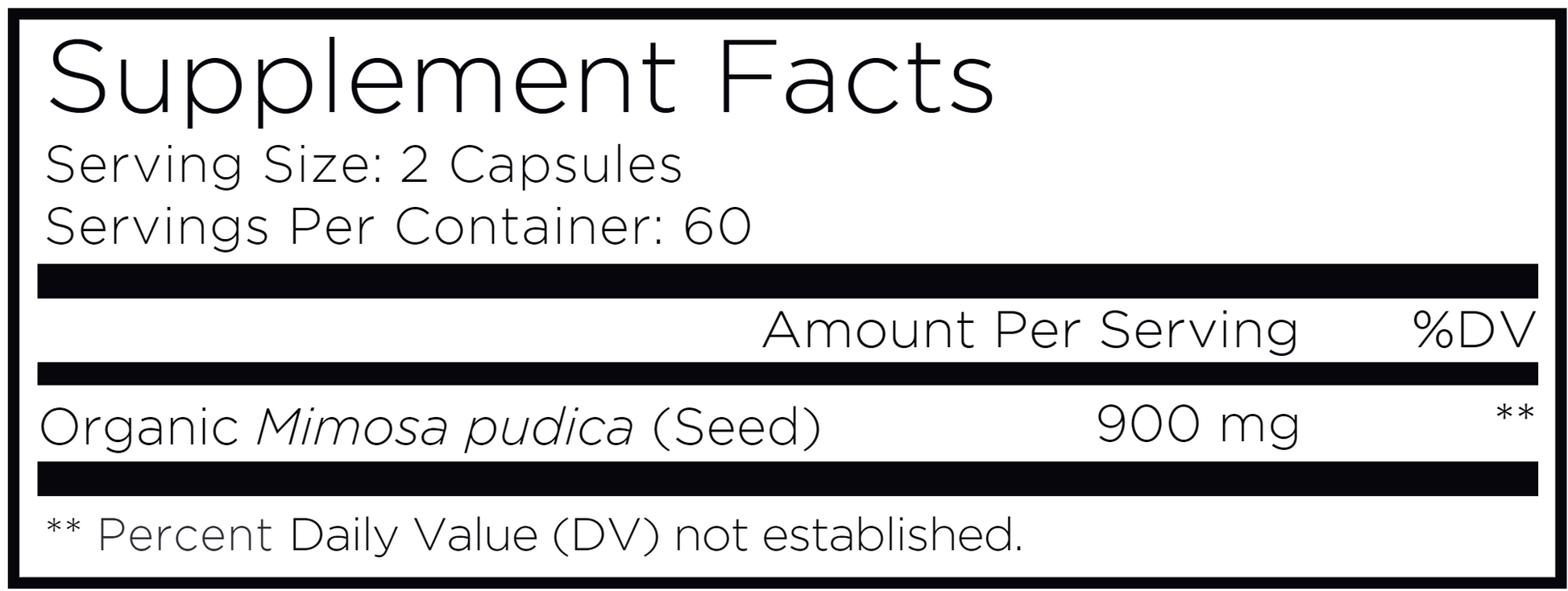 This fat-soluble dietary supplement is made with organic mimosa pudica seeds with no fillers, additives, or excipients. This formula is non-GMO, gluten, and soy-free. Each bottle contains 120 capsules for a 2 month's supply.