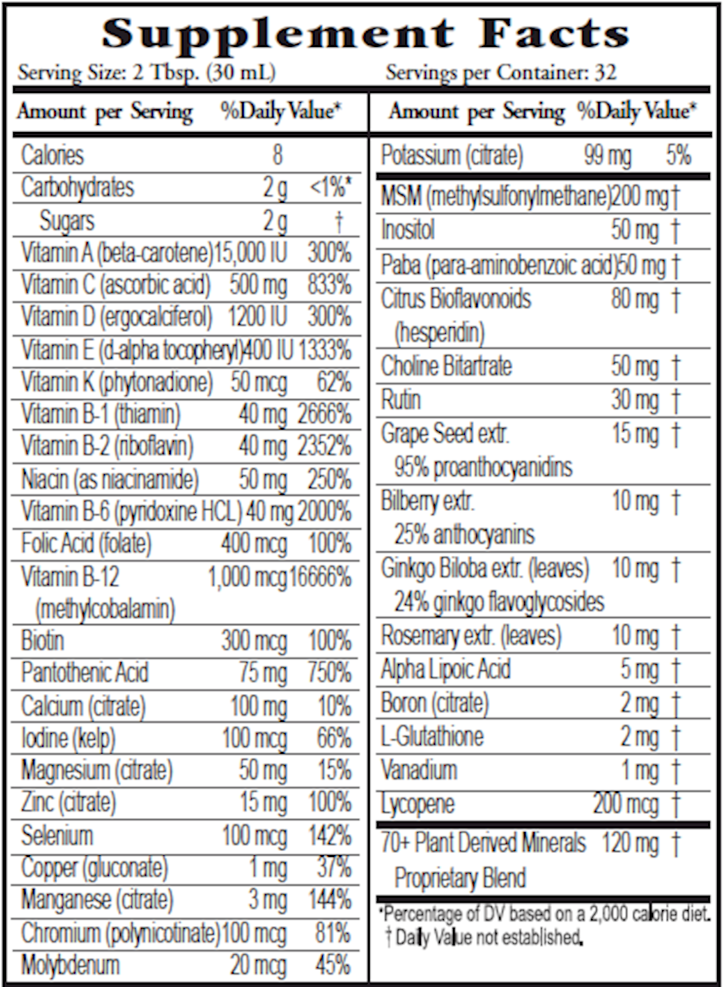 • Whole food based liquid multivitamin, mineral and herbal blend for active adults in an easy to swallow.