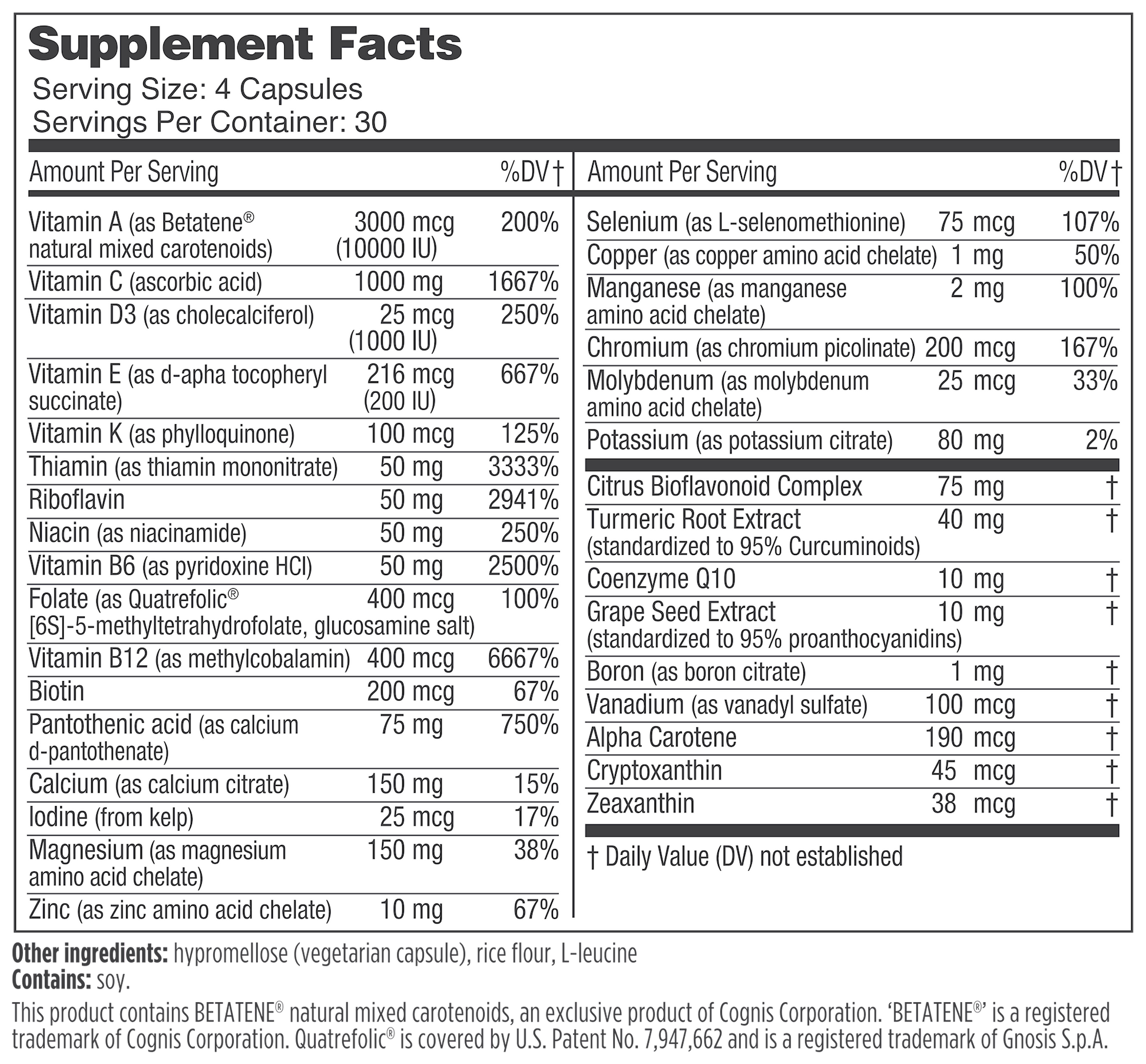 • additional antioxidant protection with CoQ10, grape seed extract, Turmeric root extract standardized to 95% curcuminoids, and citrus bioflavonoids.*